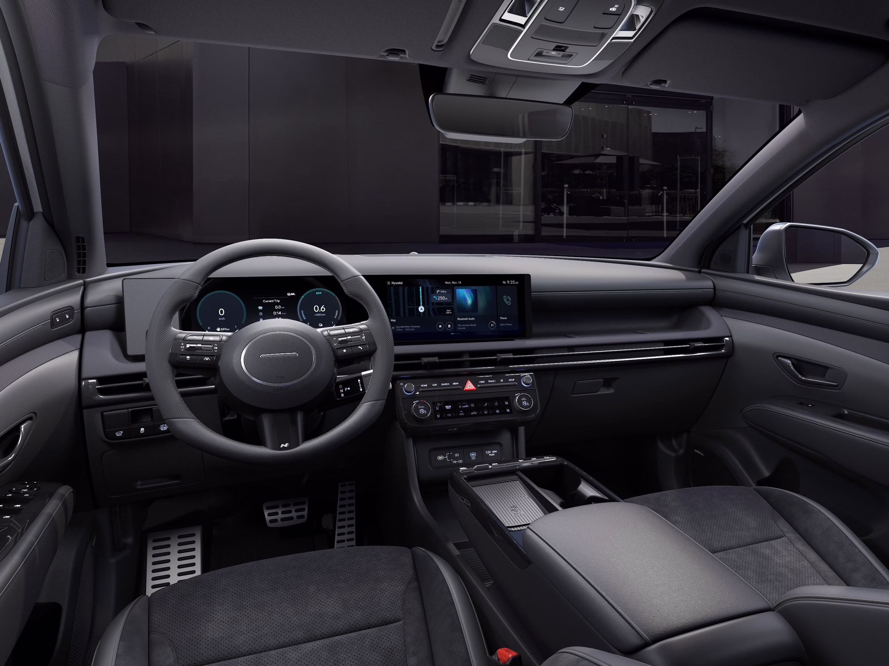 Le design extérieur du Tucson Hybrid Creative N-Line 2025 marque une continuité réussie avec la génération précédente, tout en affinant ses lignes pour un rendu plus athlétique. La face avant, avec sa calandre massive et ses phares LED "seamless" intégrés, projette une image moderne et agressive, renforcée par les éléments N-Line : logo spécifique, diffuseur arrière noir laqué et jantes 19 pouces au motif diamanté qui ajoutent une touche premium. Les flancs sculptés, avec des passages de roues prononcés, soulignent sa stature musclée, tandis que l'arrière adopte des feux horizontaux connectés qui s'étirent sur toute la largeur, pour un effet visuel élargi.